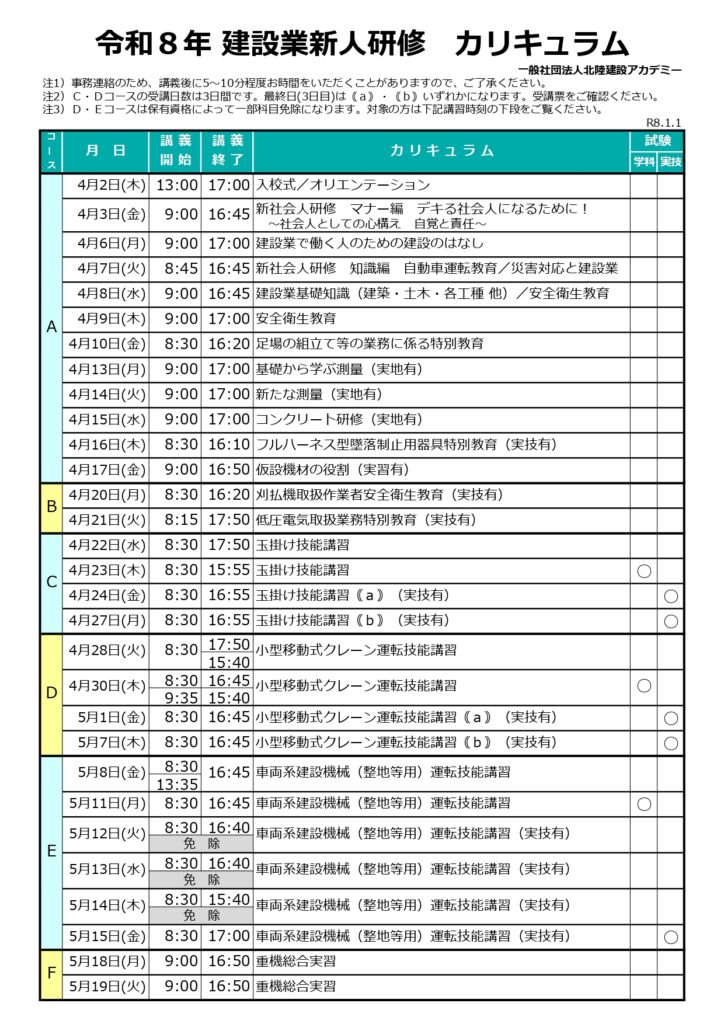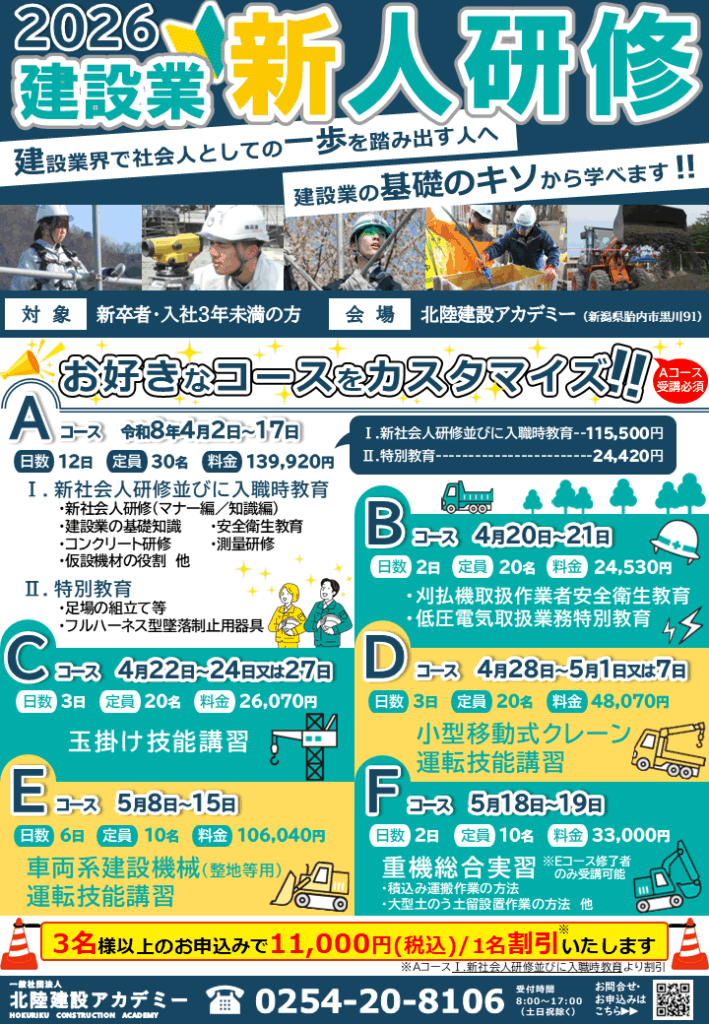昨日募集を開始しました「令和8年建設業新人研修」につきまして、急遽、重機総合実習(旧Eコース相当)を本年度も開催する運びとなりました。